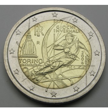 Opis: v jedru kovanca je podoba smučarja v zavoju. Nad njim sta izpisani besedi »GIOCHI INVERNALI«, levo pa je prizorišče olimpijskih iger označeno z besedo »TORINO« in podobo znamenitosti Torina, stavbe Mole Antonelliana. Levo od smučarja sta tudi monogram Italijanske republike, »RI« in oznaka kovnice »R«. Na njegovi desni je letnica izdaje (2006) in začetnici oblikovalke Marie Carmele Colaneri »MCC«. Motiv obkroža 12 zvezd Evropske unije.