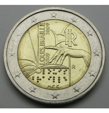 Opis: na kovancu je upodobljena roka, ki z dotikom bere odprto knjigo. Kazalec kaže na navpični napis »LOUIS BRAILLE 1809–2009«, dve ptici v letu nad roko pa simbolizirata svobodo znanja. Monogram Republike Italije »RI« je zgoraj desno, medtem ko je oznaka kovnice »R« spodaj desno. Pod knjigo je napisano Braillevo ime v pisavi, ki jo je izumil. Povsem spodaj so začetnice »MCC«, ki označujejo ime oblikovalke Marie Carmele Colaneri. Na kolobarju je 12 zvezd Evropske unije.