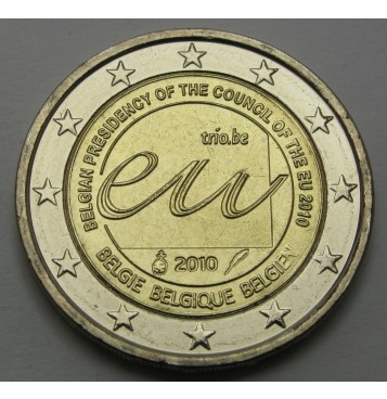 Opis: v jedru kovanca je priložnostni logotip, ki ga sestavljata stilizirani črki »EU« in napis »trio.be«. Osrednji motiv obkrožajo besede »BELGIAN PRESIDENCY OF THE COUNCIL OF THE EU 2010« in trijezično ime države »BELGIE BELGIQUE BELGIEN«. Letnica »2010« se nahaja pod logotipom in nad imenom države ter med oznako kovnice na levi in oznako predstojnika kovnice na desni.