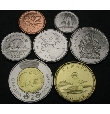 1 Cent 2011, 5 Cents 2011, 10 Cents 2011, 25 Cents 2011, 50 Cents 2007, Dollar 2018 & 2 Dollars 2016.